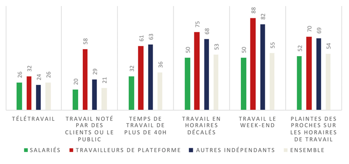 Leur travail est logiquement très numérisé puisqu’ils ont recours à une application ou à Internet pour entrer en relation avec leurs clients. Autre particularité : les travailleurs de plateforme sont 58 % à voir leur travail noté (note chiffrée, étoiles, smileys, etc.) par des clients ou le public, contre 20 % des salariés et 29 % des autres indépendants. Tout comme ces derniers, les travailleurs de plateforme ont de longs horaires : ils travaillent en moyenne 42 heures par semaine, contre 36 heures pour les salariés. Les pratiques sont toutefois hétérogènes : 28 % ont un temps de travail hebdomadaire inférieur à 35 heures quand 61 % travaillent 40 heures ou plus. Au-delà de la durée du temps de travail, ils ont aussi fréquemment des horaires de travail atypiques : ils travaillent plus souvent en horaires décalés (soir, nuit ou très tôt le matin – 75 %) ou le week-end (88 %) que les autres indépendants (68 % / 82 %) ou que les salariés (50 % / 50 %). Les travailleurs des plateformes et les autres indépendants sont ainsi nombreux à recevoir des plaintes de leurs proches sur leurs horaires.